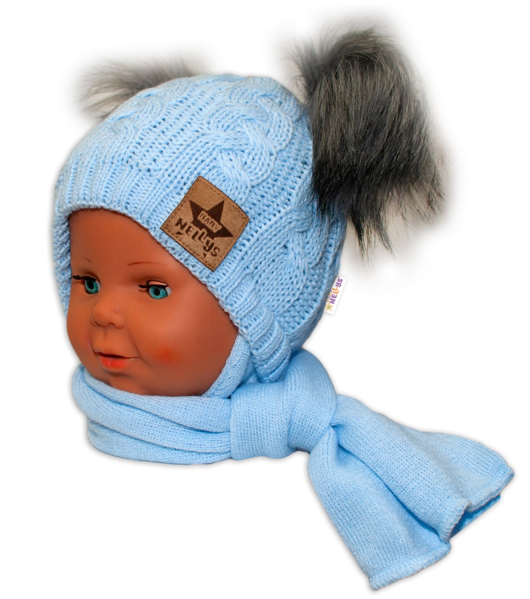 - BABY NELLYS Zimní čepička s šálou - chlupáčkové bambulky - modrá, šedé bambulky