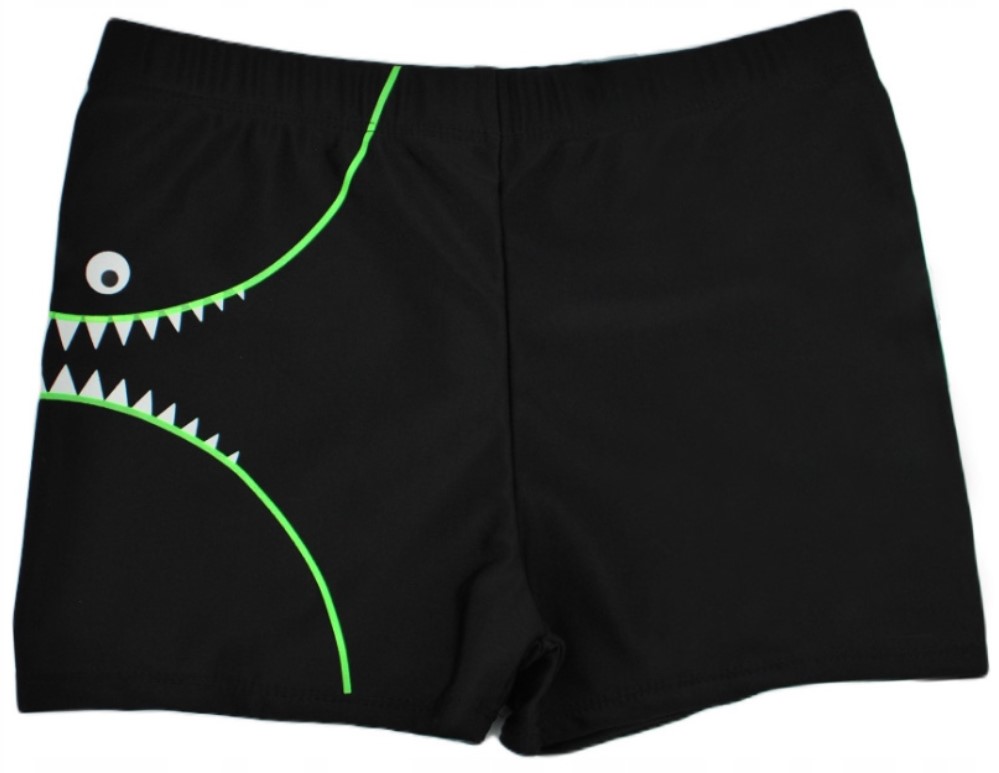 Chlapecké černé plavky s potiskem žraloka na boku. Díky stahovacímu pasu a regulaci pomocí šňůrky se dají individuálně přizpůsobit postavě. Uvnitř šortek je vpředu všit další jemný materiál, který zabraňuje oděrkám kůže.