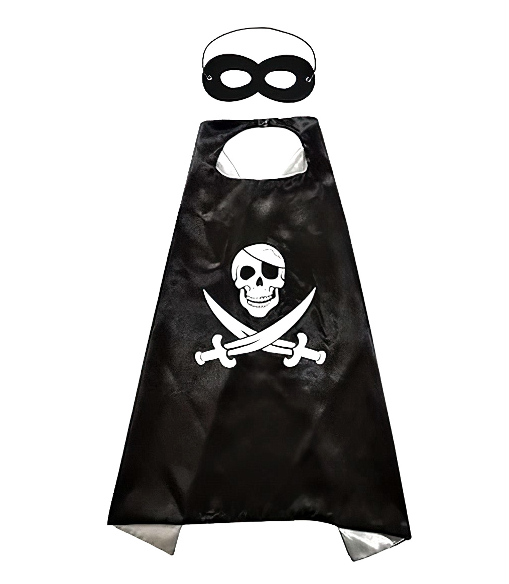 Sada zahrnuje černý plášť s klasickým pirártským symbolem lebky a zkřížených mečů a černou masku na oči pro autentický pirártský vzhled.