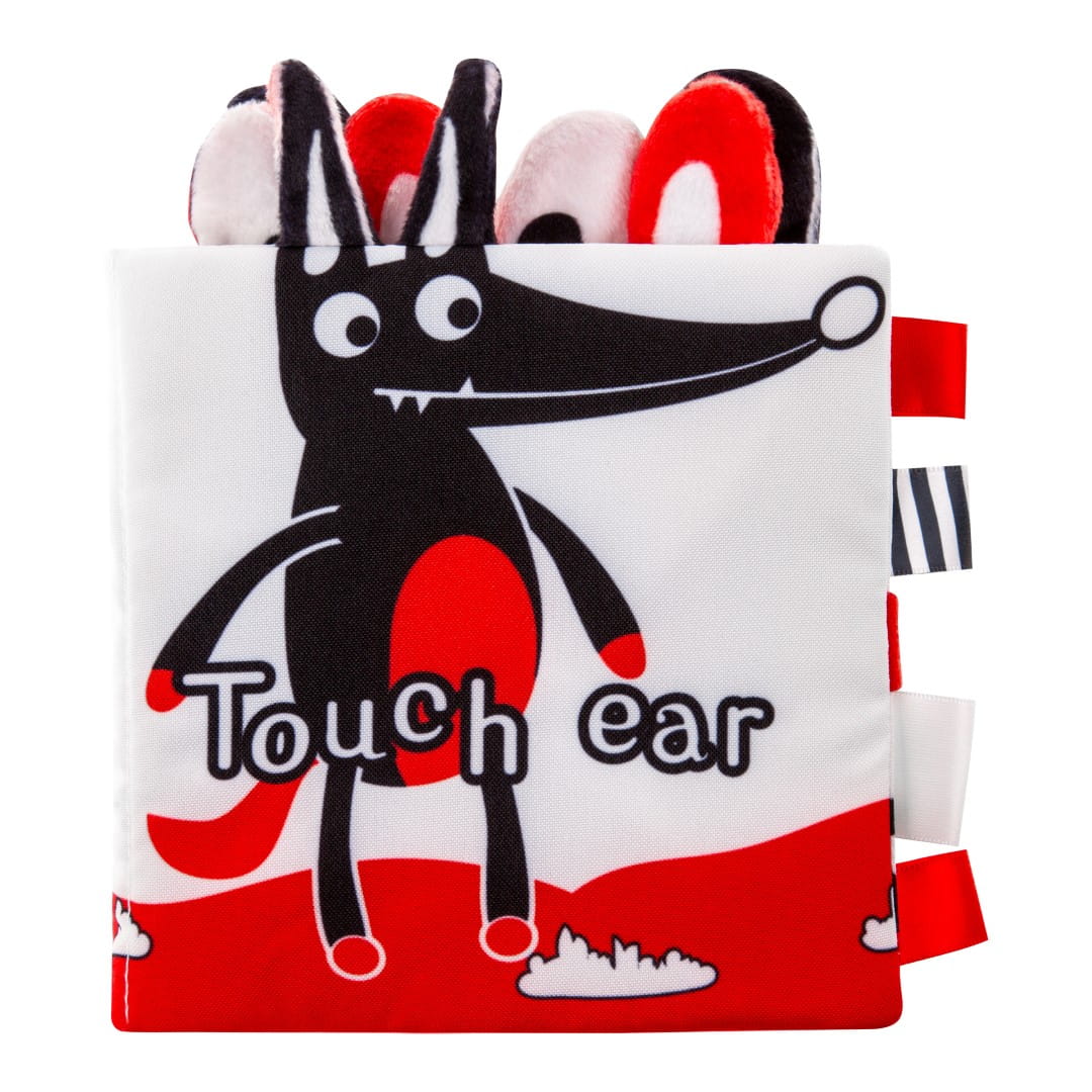Měkká kontrastní knížka z měkkého, na dotek příjemného materiálu, v kontrastních barvách, šustí a chrastí.