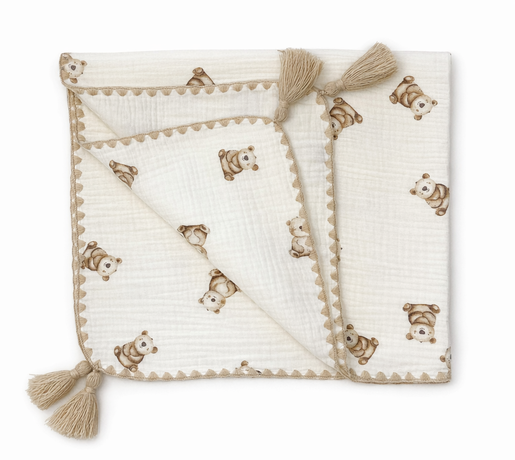 Mušelínová dětská deka 75 × 90 cm, s bambulkami, bavlněná pro miminko - Medvídek
