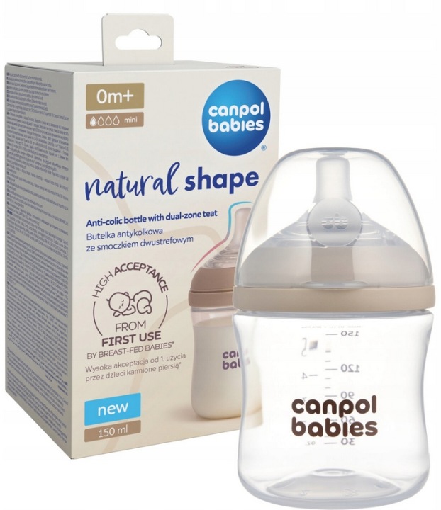 Moderní antikoliková láhev pro novorozence navržená tak, aby co nejvíce napodobovala přirozené kojení. Láhev Canpol Babies Natural Shape podporuje správné sání, široké přisátí a pomáhá snížit riziko koliky i nepohodlí během krmení.