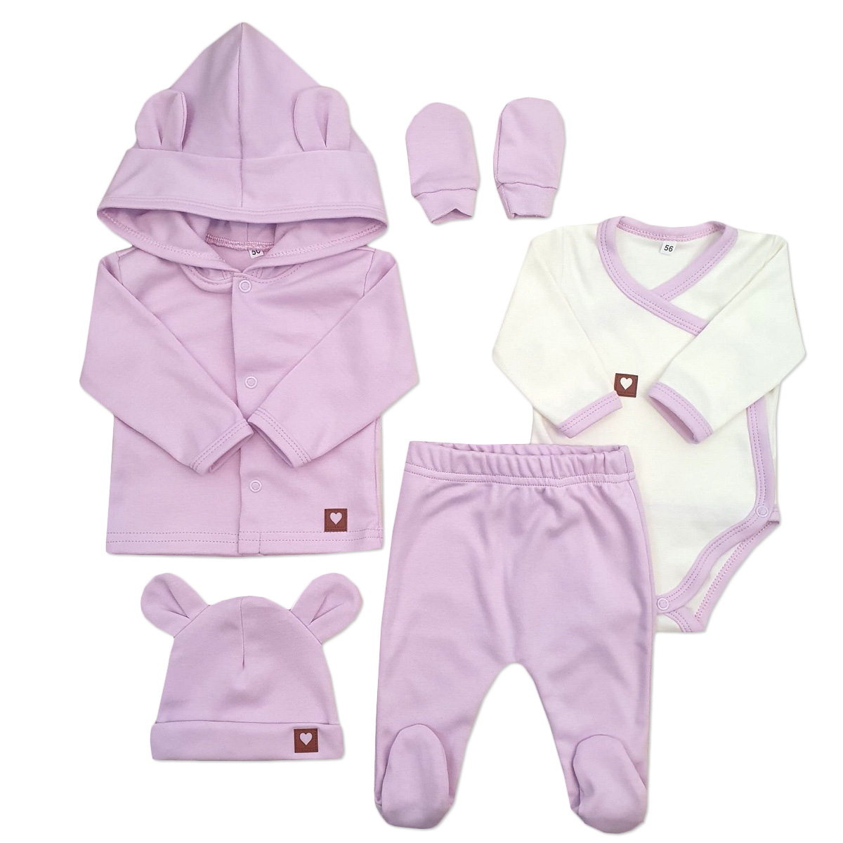 Sada do porodnice 5D, body, polodupačky, kabátek, čepička, rukavičky, lila