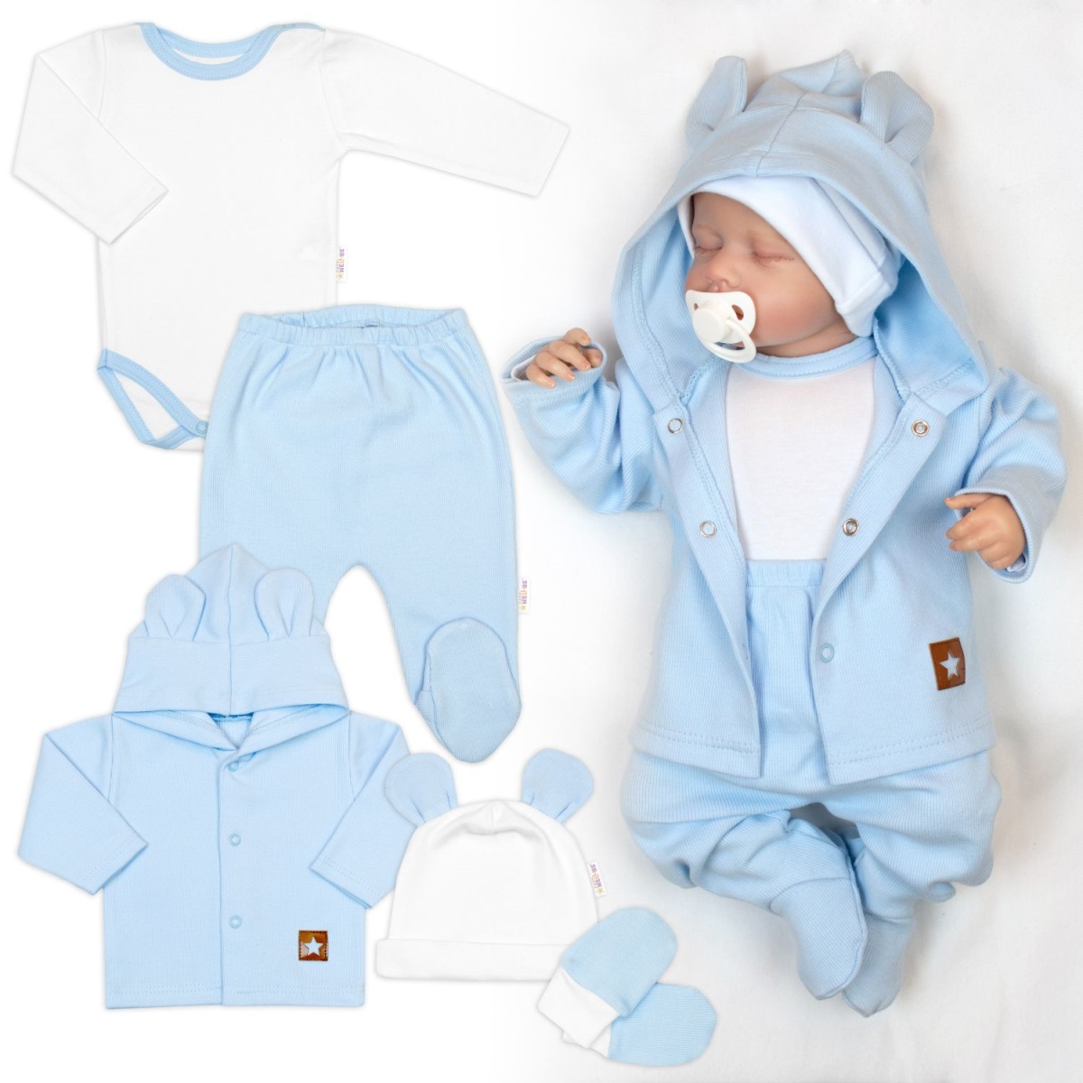- Žebrovaná sada, Star 5D, body, polodupačky, kabátek, čepička, rukavice - modrá, bílá