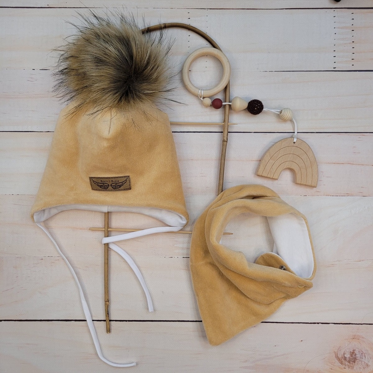 - Zimní dvouvrstvá čepice na zavazování s bambulí z kožešinky + šátek Z&Z, béžová, vel.68/74